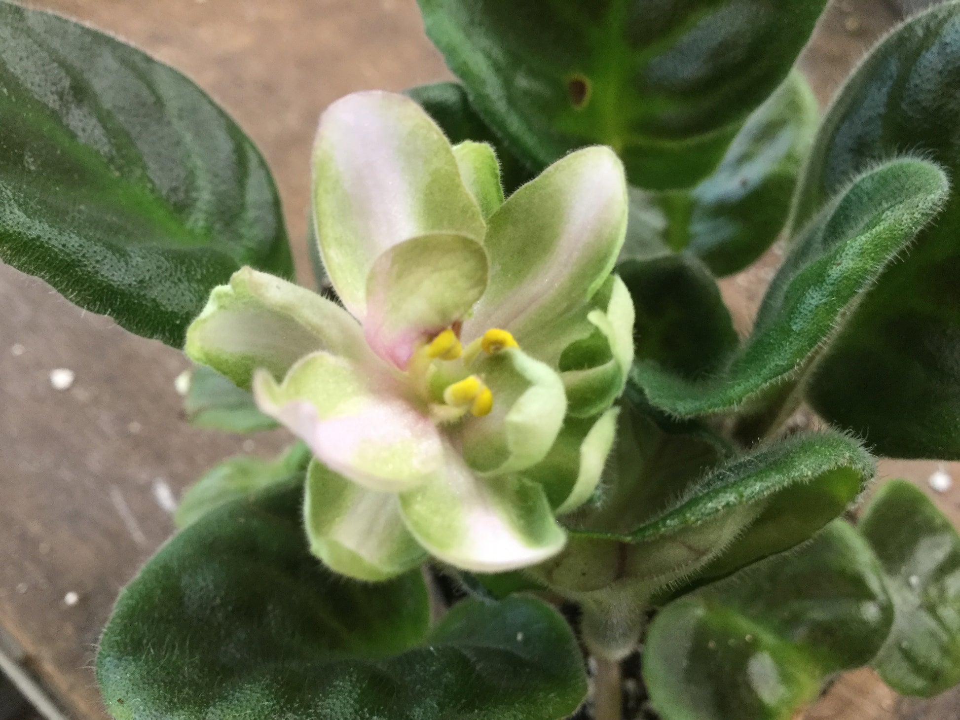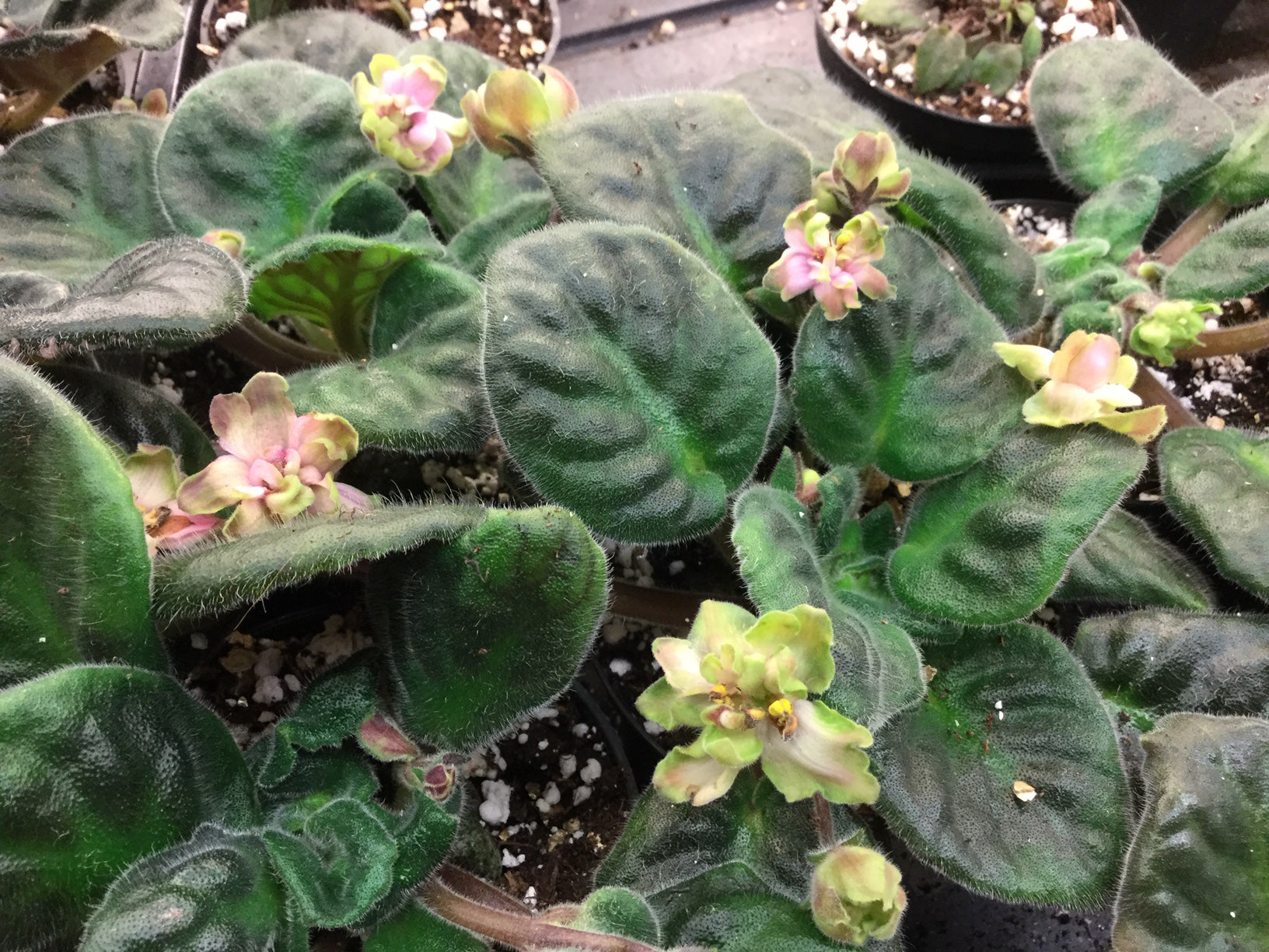 A Russian saintpaulia that is called 'Wild Hops'. Pale pink flowers with a distinct green edge. Dark green, quilted oval leaves.