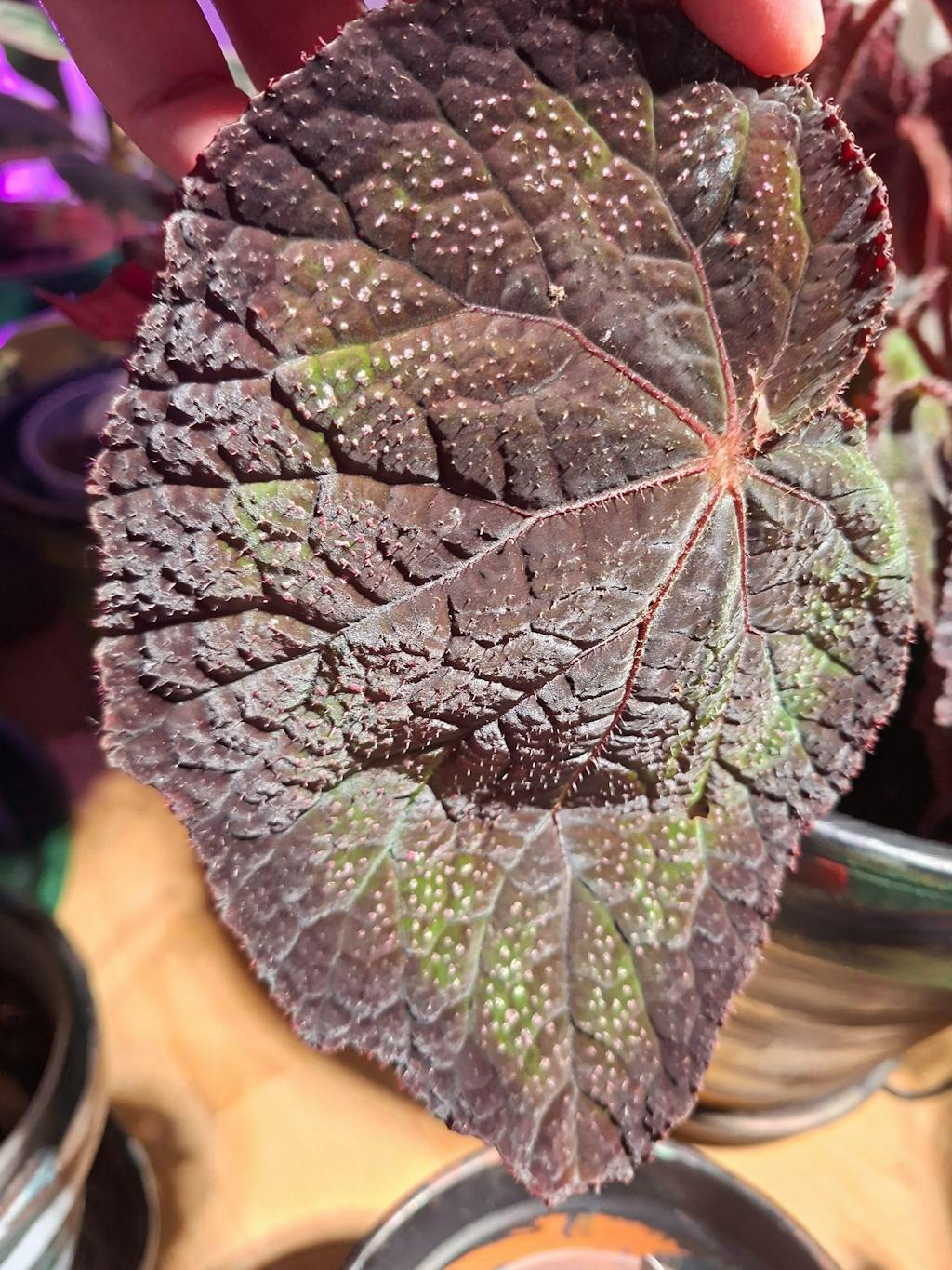 A large leaved begonia that is deep burgundy in colour; on the leaf surface there is a ring of pale pink and white speckles defining the leaf shape.