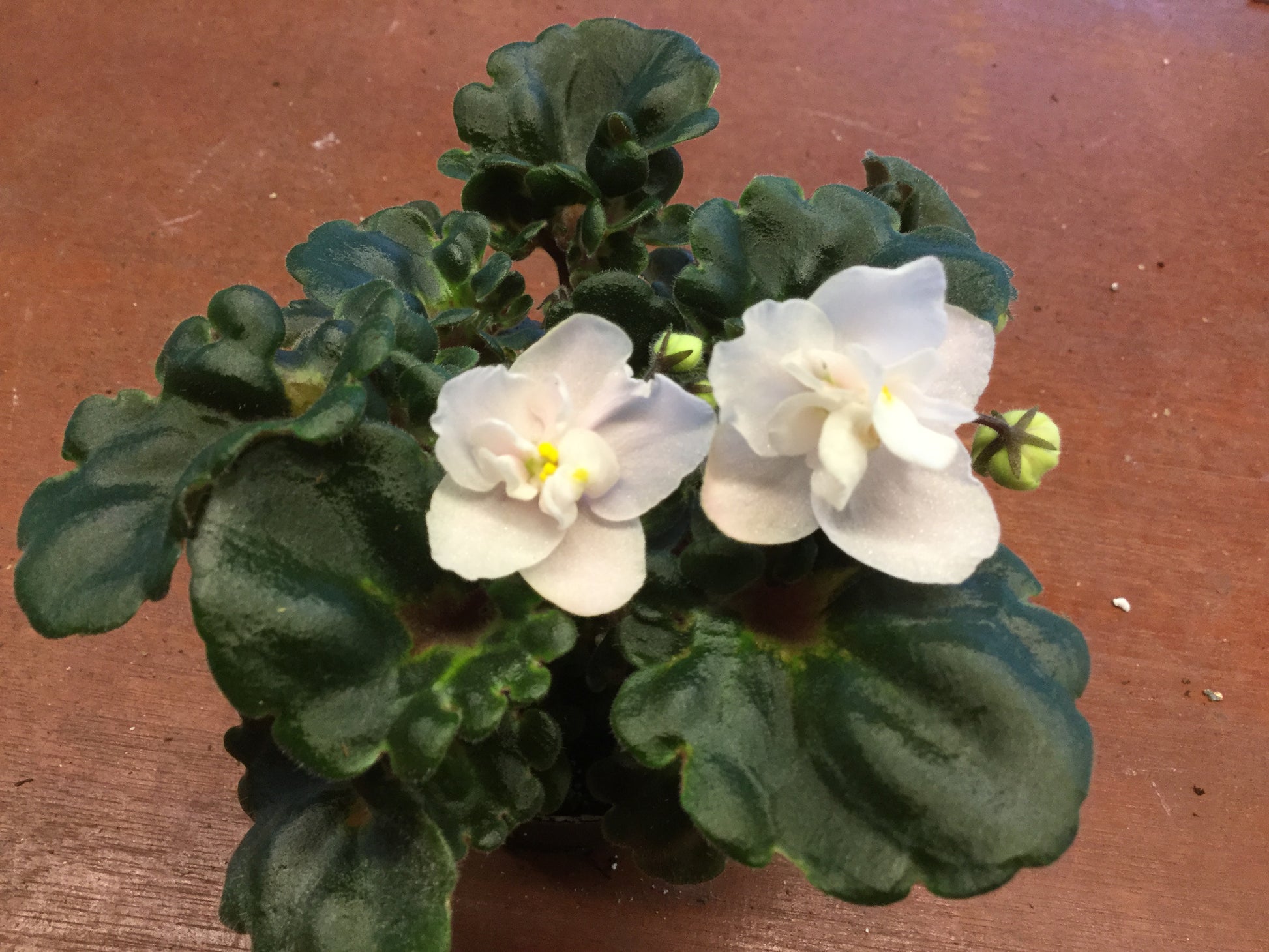 This cute miniature is named after the Greek goddess Athena and has not only lovely dark green girl leaves but also huge white semi-double flowers that can have occasionally blue or fuchsia fantasy specks.