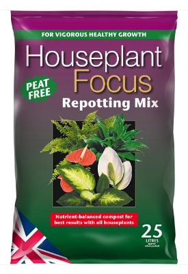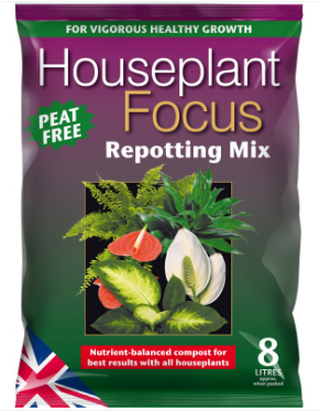 Houseplant Focus Repotting Mix is peat free and is designed for best results with the widest range of houseplants. A free draining mixture helps to promote healthy root growth. It contains sterilised soil, coir, composted fine bark, wood fibre, as well as a carefully balanced range of nutrients to promote healthy growth for up to two months.