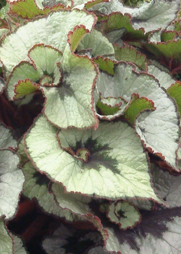 A spiral leaf Begonia with rich silver satin leaves and a pink blush centre. A compact grower.