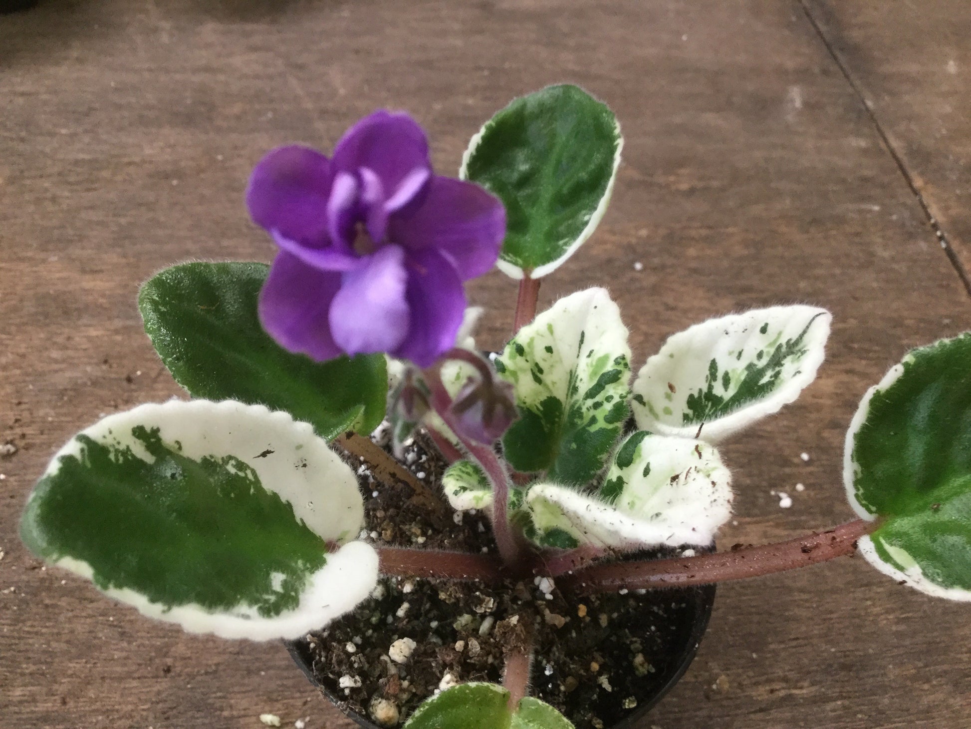 Simple lavender pansy-shaped flowers. Tommie Lou variegated leaves (medium green and white) that are pointed.